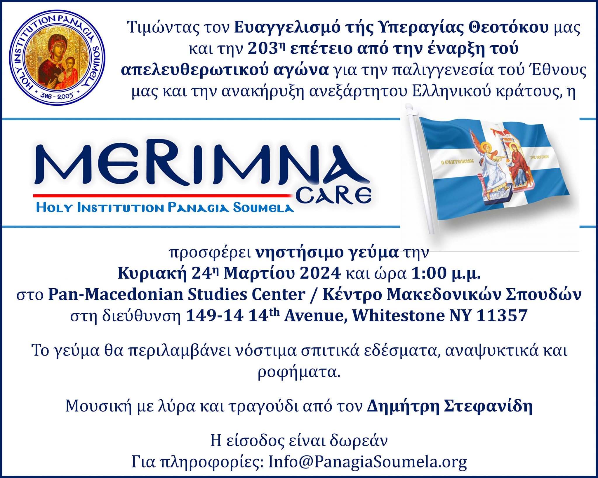 Τιμώντας τον Ευαγγελισμό τής Υπεραγίας Θεοτόκου μας και την 203η επέτειο από την έναρξη τού απελευθερωτικού αγώνα για την παλιγγενεσία τού Έθνους μας και την ανακήρυξη ανεξάρτητου Ελληνικού κράτους, η MERIMNA Care τού Ιερού Ιδρύματος ΠΑΝΑΓΙΑ ΣΟΥΜΕΛΑ προσφέρει νηστήσιμο (ή νηστίσιμο ... κατά άλλους) γεύμα στο Κέντρο Μακεδονικών Σπουδών (Pan-Macedonian Studies Center) στη διεύθυνση 149-14 14th Avenue, Whitestone, NY 11357 την Κυριακή 24η Μαρτίου 2024 και ώρα 1:00 μ.μ.